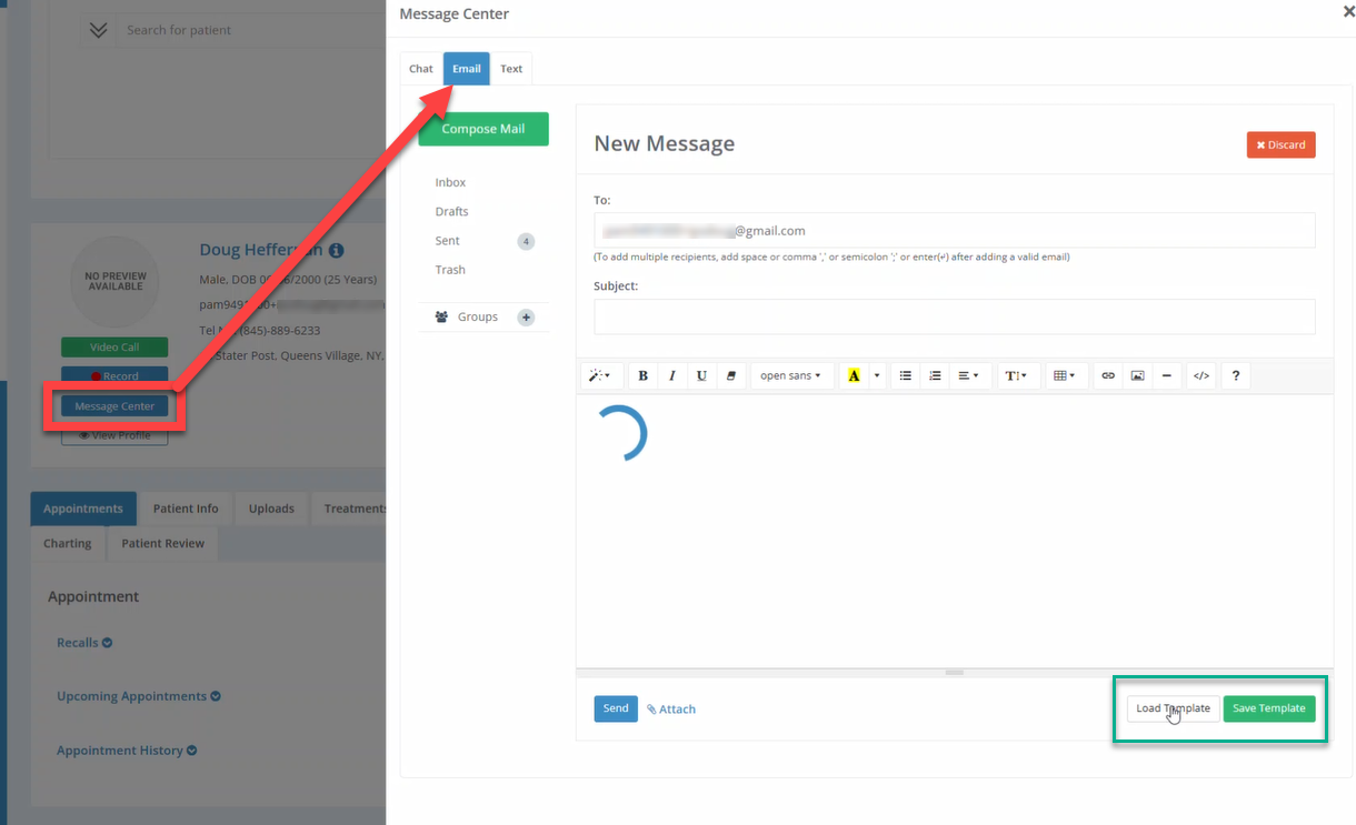 4. Repeat for Other Patients: You can now navigate to any other patient’s chart, access the message center, and click "Load Template" to reuse the same message over and over again without retyping it.