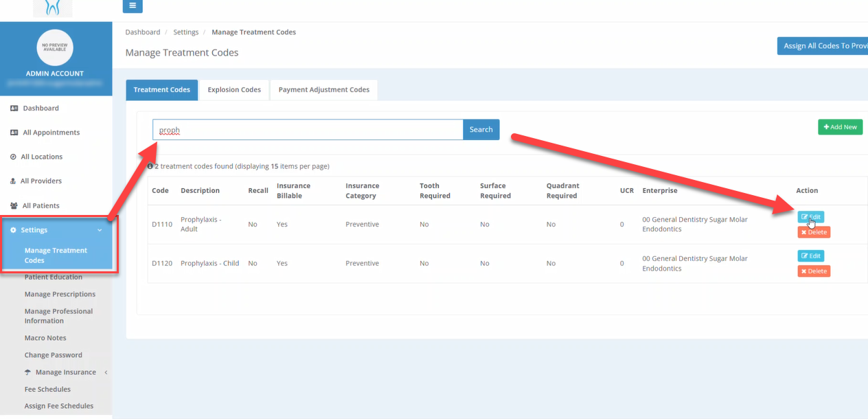 To begin, log into your admin account. From there, navigate to the Settings menu and select Manage Treatment Codes. This section contains all the fees associated with your various procedure codes.